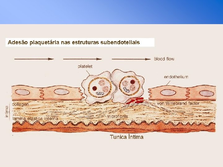 Adesão n Rompimento vascular expõe os componentes prócoagulantes do sub-endotélio (matrix extracelular, colágeno, proteoglicanos, e fibronectina); n O Fv. W atua como uma ponte de adesão entre o complexo GP Ib-V-IX da plaqueta e o colágeno exposto; n As plaquetas aderem-se a fibronectina das microfibrilas subendoteliais; n A associação Fv. W-GPIb é a ligação mais forte para superar a força do fluxo sanguíneo.