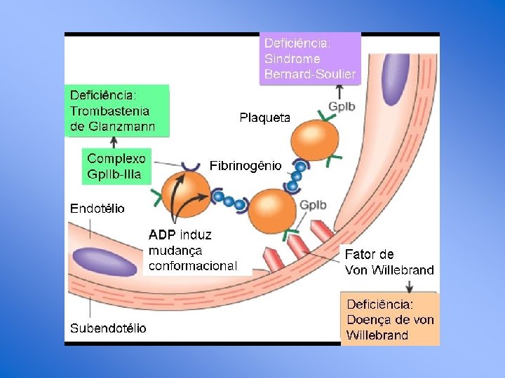 Glicoproteinas receptoras n GP Ib-V-IX: complexo de quatro produtos genicos, serve como um receptor para Fv. W; adesão - (Bernard-Soulier) n GP IIb-IIIa: mais abundante, reconhece os quatro receptores de adesão: fibrinogênio, fibronectina, vitronectina, e Fv. W; agregação - (Glanzmann) n Outros: – GP Ia, IIa; GP VI: receptores do colágeno