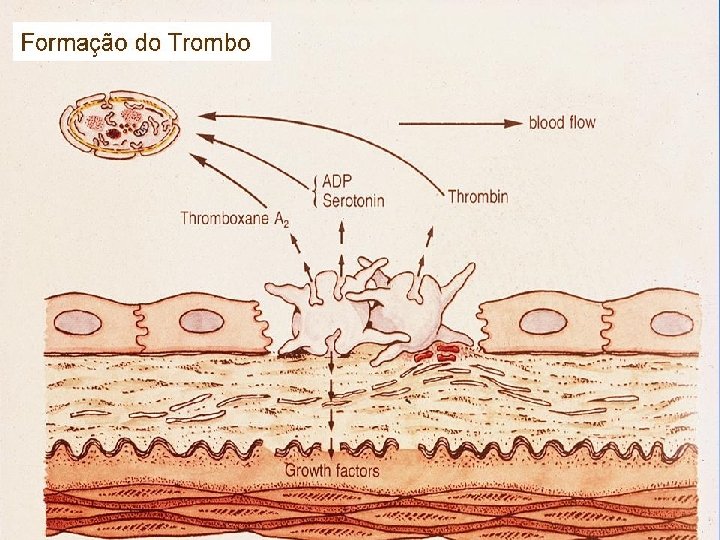 Organelas da Plaqueta n Mitocondria, Aparelho de Golgi, ribossomos, peroxisomos, lisossomos n Dois tipos de Grânulos de armazenamento: – Grânulos Alpha: Fator 4 Plaquetário , PDGF, fibrinogênio, fibronectina, inibidor I do ativador de plasminogênio (PAI I), Fatores V, VIII, e Fv. W – Corpos Densos: histamina, epinefrina, serotonina, ADP, cálcio