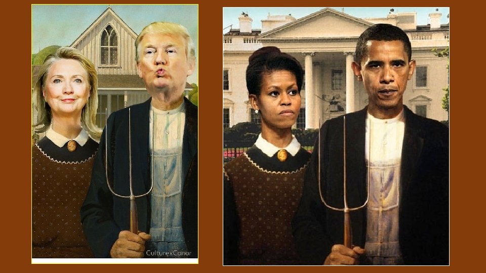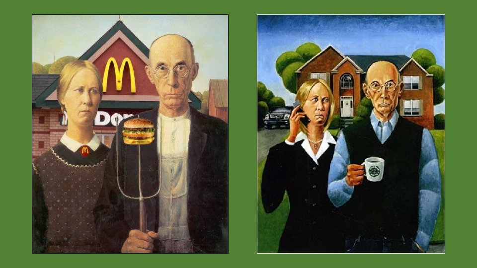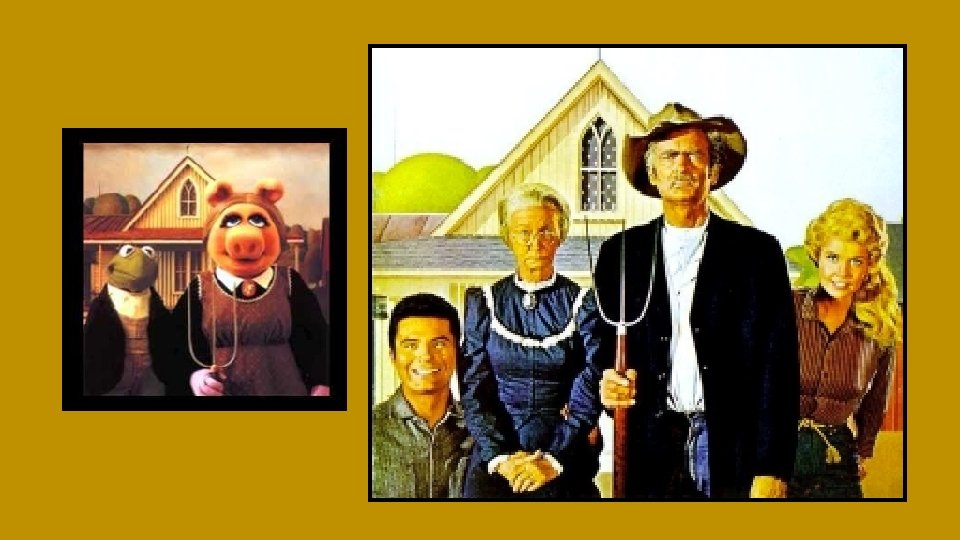 Le tableau représente un paysan à coté de sa fille, vêtue d’un tablier, la fourche représente le labeur. L’image la plus connue de l’Art Américain du 20 eme siècle. Souvent critiquée aussi. Pour réaliser le montage, il remarque cette maison, recrute sa sœur comme modèle et, l’Homme est inspiré de son dentiste le Docteur Byron Mc. Keebyr. En 1930, la crise économique frappe l’Amérique, le tableau est un hommage aux petites gens dignes dans la misère, il reste un repère dans l’Amérique tourmentée. De nombreuses parodies :
