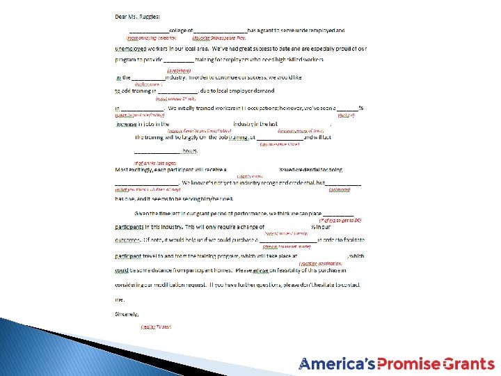 Initiating a Modification Request �Modification Request: ◦ Must be submitted on organization’s letterhead ◦ Must be signed by the Authorized Representative ◦ Indicate the purpose and why it’s necessary ◦ How the change will benefit the program ◦ Reflect the guidance provided by the FPO (and others, such as the Program Office, if applicable)