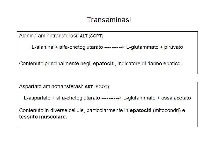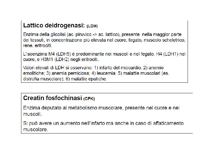 Transaminasi: Gamma-glutamil-transferasi (GGT) Epatite alcolica Epatiti Effetti collaterali ai farmaci Malattie delle vie biliari Pancreatiti Creatinchinasi CK MB Infarto del miocardio Infiammazione del miocardio Alterazioni del m. scheletrico Lesioni muscolari Transaminasi: AST (GOT) > ALT (GPT) Amilasi Siero e urina Pancreatiti AST aspartato transferasi (GOT transaminasi glutamico-ossalacetico) ALT alanino amino transferasi (GPT transaminasi glutamico-piruvico) Epatite infettiva, cirrosi epatica, tumori e metastasi del fegato, malattie delle vie biliari Altri organi: infarto del miocardio, embolia polmonare LDH 1 e 2 Infarto del miocardio Miocarditi Embolia polmonare Malattie del fegato e delle vie biliari malattie muscolari Troponina I e T Infarto del miocardio Mioglobina Infarto traumi muscolari