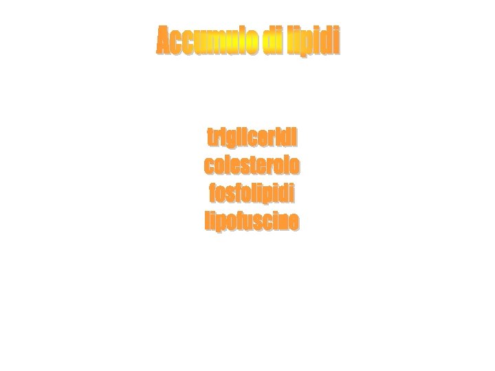 Granuli o goccioline anomale sono spie di un danno cellulare Il materiale accumulato può derivare: v dal normale metabolismo della cellula, (eccesso di acqua, lipidi, proteine e carboidrati) v prodotto di una sintesi o di un metabolismo alterato v dall’ambiente esterno, La cellula può accumulare: acqua ed elettroliti lipidi carboidrati proteine pigmenti