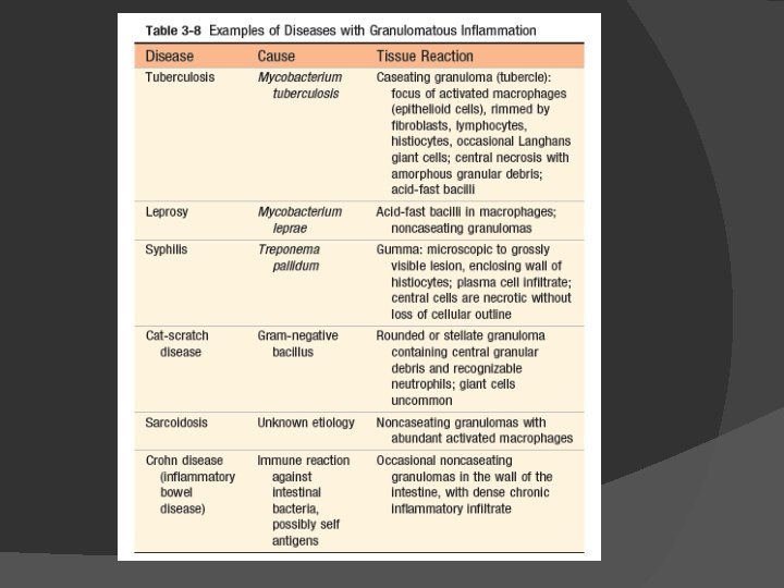 TAKE HOME MESSAGES: Granulomatous inflammation is a distinctive pattern of chronic inflammation characterized by aggregates epithelioid macrophages. � Damaging stimuli which provoke a granulomatous inflammatory response include; microorganisms which are of low inherent pathogenicity but which excite an immune response. � � Granulomata are produced in response to: ○ Bacterial infection. ○ Parasitic infection: e. g. Schistosoma infection. ○ Certain fungi cannot be dealt with adequately by neutrophils, and thus excite granulomatous reactions. ○ Non-living foreign material deposited in tissues, e. g. keratin from ruptured epidermal cyst. ○ Unknown factors, e. g. in the disease 'sarcoidosis' and Crohn's disease.