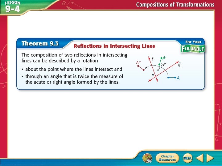 Copy and reflect figure ABC in line S and then line T. Then describe a single transformation that maps ABC onto A''B''C''. A. ABC is reflected across lines and translated down 2 inches. B. ABC is translated down 2 inches onto A''B''C''. C. ABC is translated down 2 inches and reflected across line t. D. ABC is translated down 4 inches onto A''B''C''. A. B. C. D. A B C D