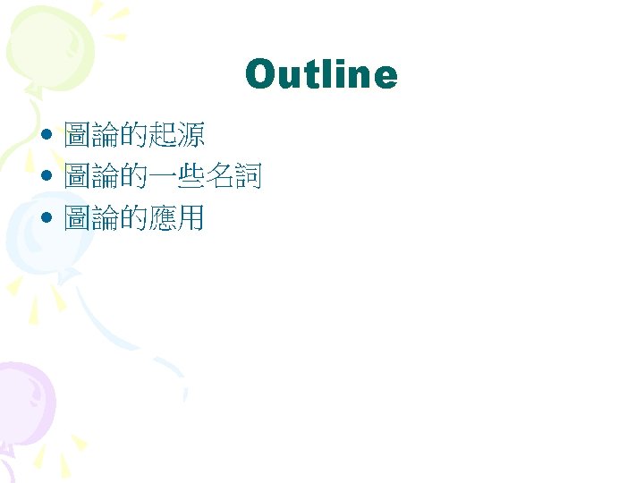 Graph Theory with Applications Advanced Graph Theory Topics Slides: 37 Download presentation Graph Theory with Applications Advanced Graph Theory Topics • Minimum Spanning Tree • Planar Graph • Network Flows Minimum Spanning Tree • 一個weighted graph可含有多種 spanning tree • 所有邊的weight總 和最小稱之為 minimum spanning tree(最 小生成樹) Network Flows • 一個weighted digraph • Source and sink • 邊上的數字即代表最大容量 Max-Flow Min-Cut Theorem • 在Network當中,最大的流量就相當於所有的 cut-sets當中,最小的容量總和。 • Maximum flow = 10+8+7+4 = 29 參考資料 • Graph Theory with Applications to Engineering and Computer Science, Narsingh Deo, Prentice-Hall Inc. , 1974 • Graph Theory – An Algorithmic Approach, Nicos Christofides, Academic Press, 1975 • http: //www. cs. sunysb. edu/~skiena/c ombinatorica/animations/