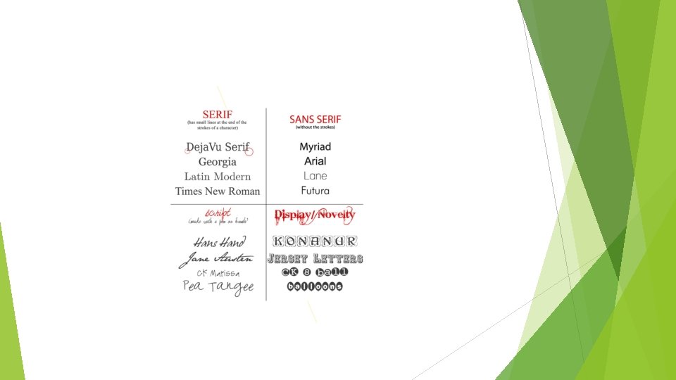 III. Typography 1. Font 2. Font style (Serif, Sans-Serif, Script, Display) 3. Font selection 4. Hieararchy of fonts 5. Text Composition