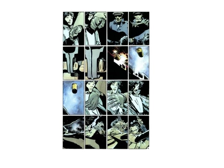 Cinematic • Comics grew as popular medium alongside film, eg American newspapers • Comics started replicating cinematic qualities: establishing shots, wide angle, close-ups, collection/sequence of scenes • Both film and comic are a succession of still images, edited together – but we examine the transition from one to another in comics • Tarantino: fight scene as ultimate filmmaking challenge – kinetic movement (velocity, impact, exertion, straining muscles) • Comics have become more graphic as Hollywood has moved towards more action/fantasy based product (fight scenes, sci-fi themes, conspiracy theories • A loop of film reflecting graphic novels