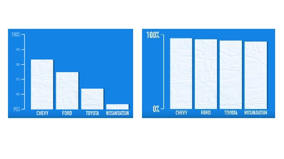 • Y axis can be too big • Y axis can be too small • Y axis can skip #s (broken) • Y axis might not start at 0 • Y axis has no scale • Y axis has incorrect scale* • Y axis might not be labelled
