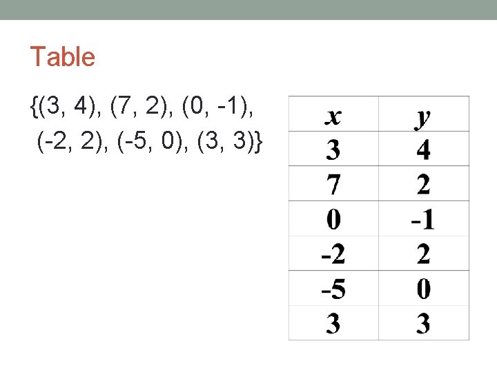 Relations and Functions Given the relation: {(2, -6), (1, 4), (2, 4), (0, 0), (1, -6), (3, 0)} State the domain: D: {0, 1, 2, 3} State the range: R: {-6, 0, 4}