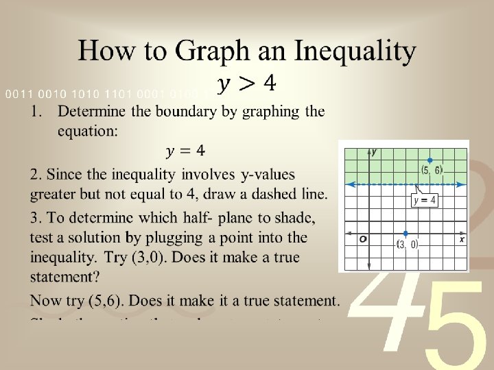 Graphing Linear Inequalities • The graphs of these ordered pairs fill a region on the coordinate plane called a halfplane. An equation defines the boundary or edge of each half-plane.