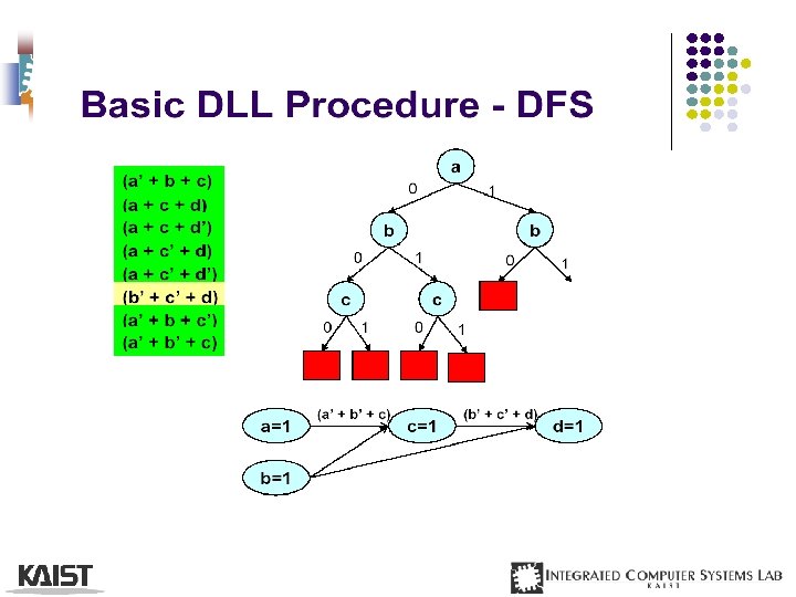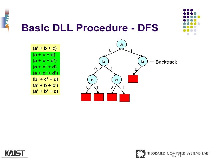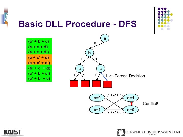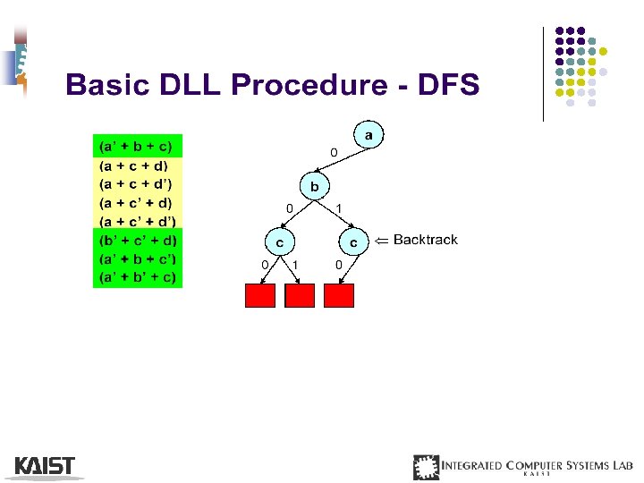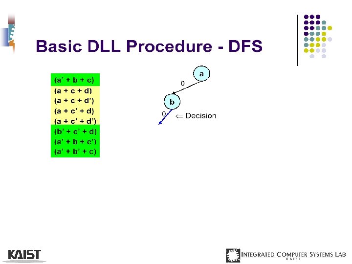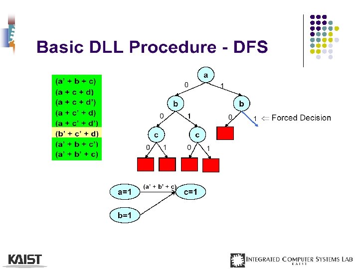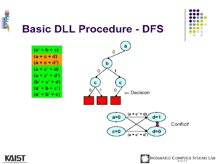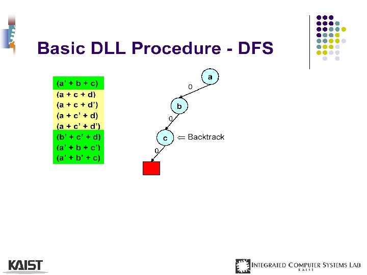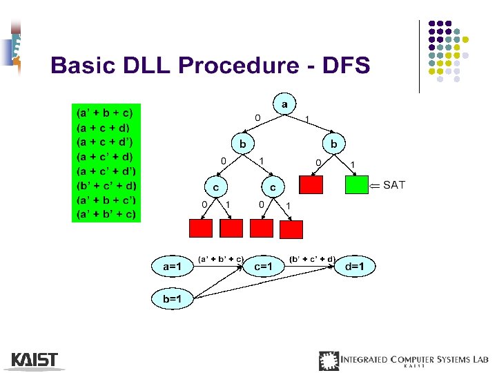 DLL Algorithm v Davis, Logemann and Loveland n v v M. Davis, G. Logemann and D. Loveland, “A Machine Program for Theorem-Proving”, Communications of ACM, Vol. 5, No. 7, pp. 394 -397, 1962 Basic framework for many modern SAT solvers Also known as DPLL for historical reasons
