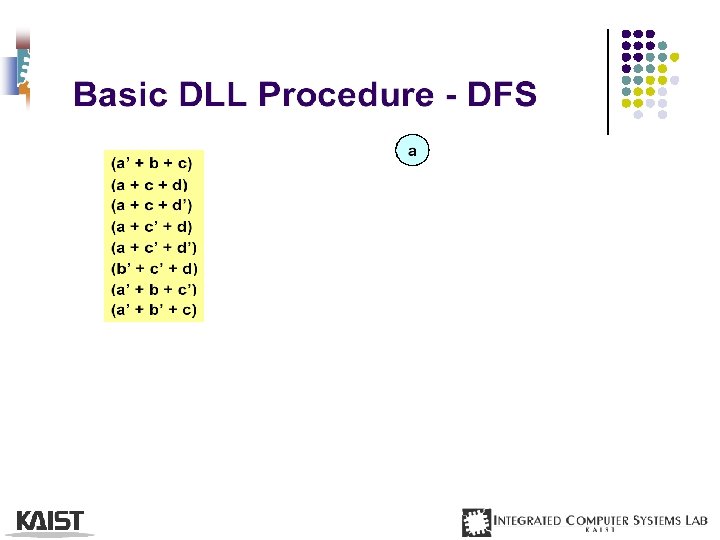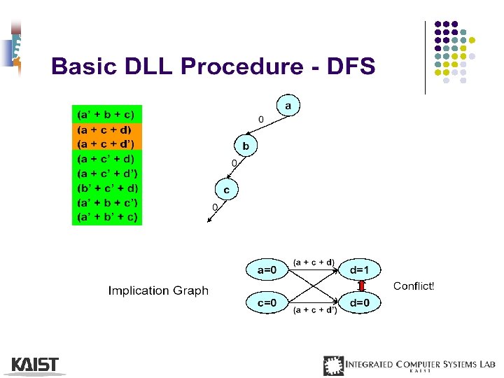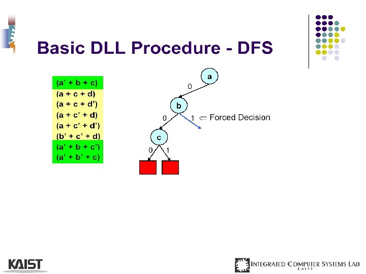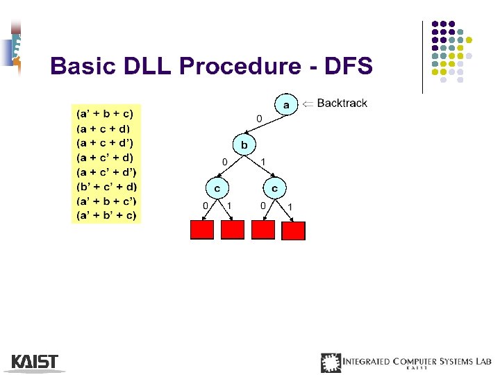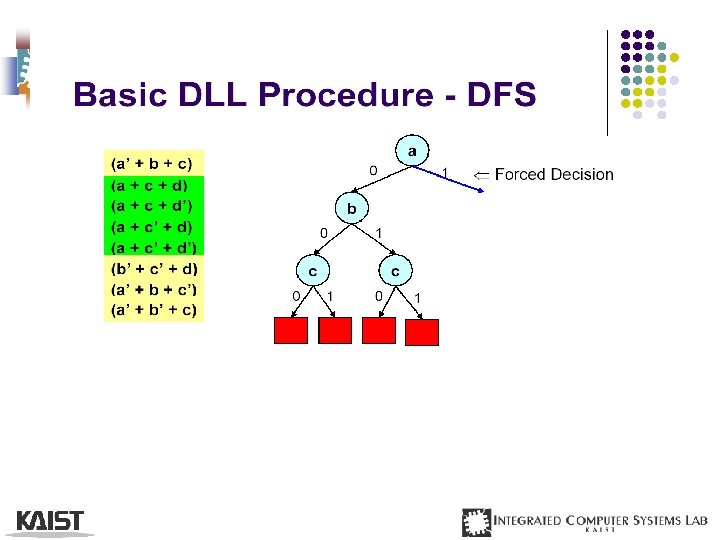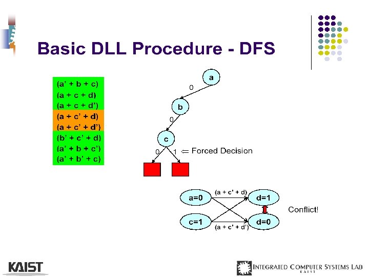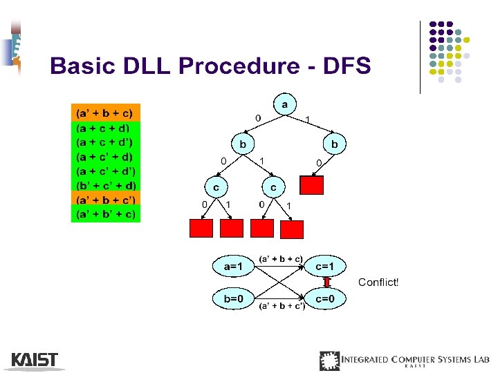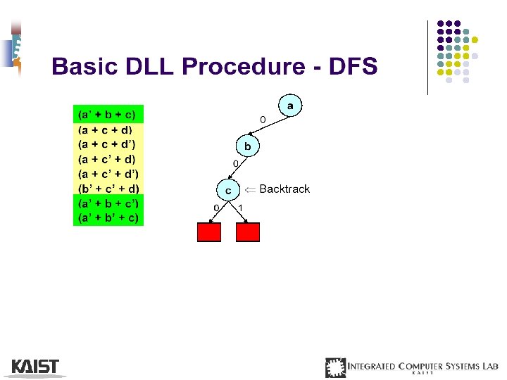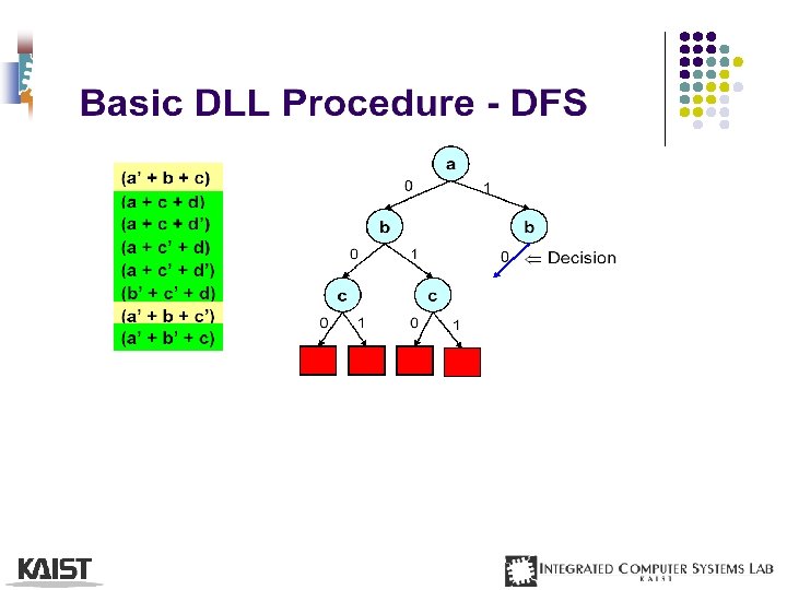 DLL Algorithm v Davis, Logemann and Loveland n v v M. Davis, G. Logemann and D. Loveland, “A Machine Program for Theorem-Proving”, Communications of ACM, Vol. 5, No. 7, pp. 394 -397, 1962 Basic framework for many modern SAT solvers Also known as DPLL for historical reasons