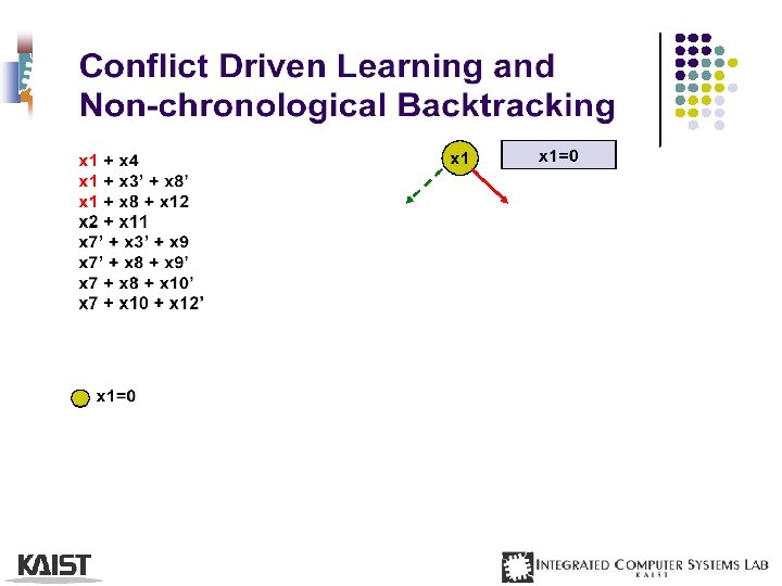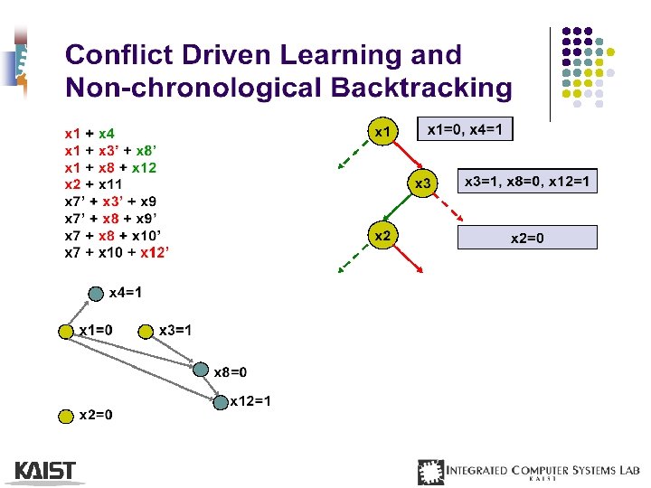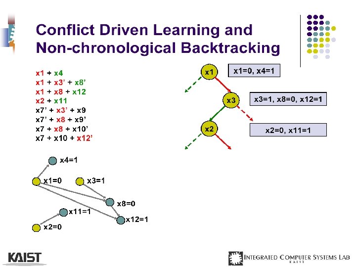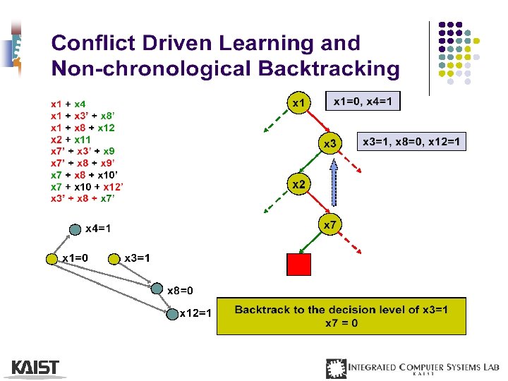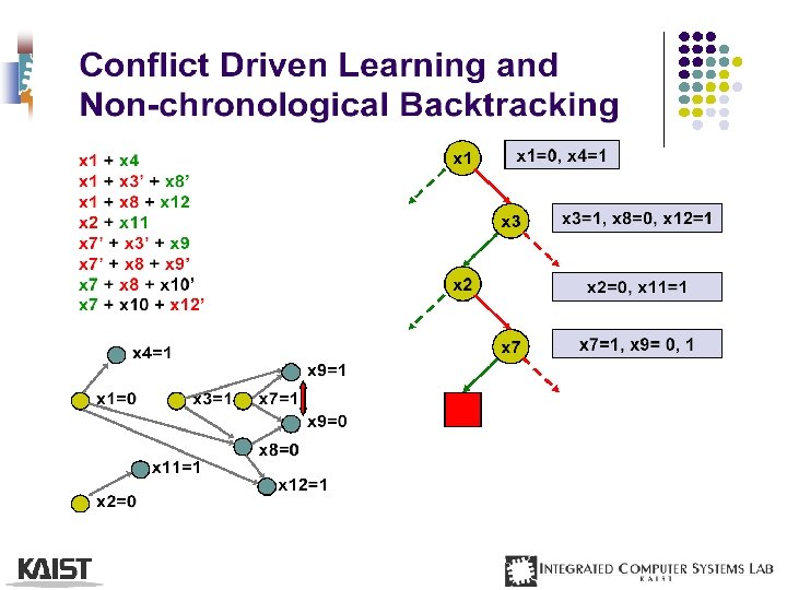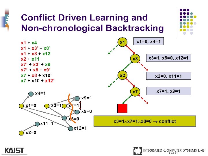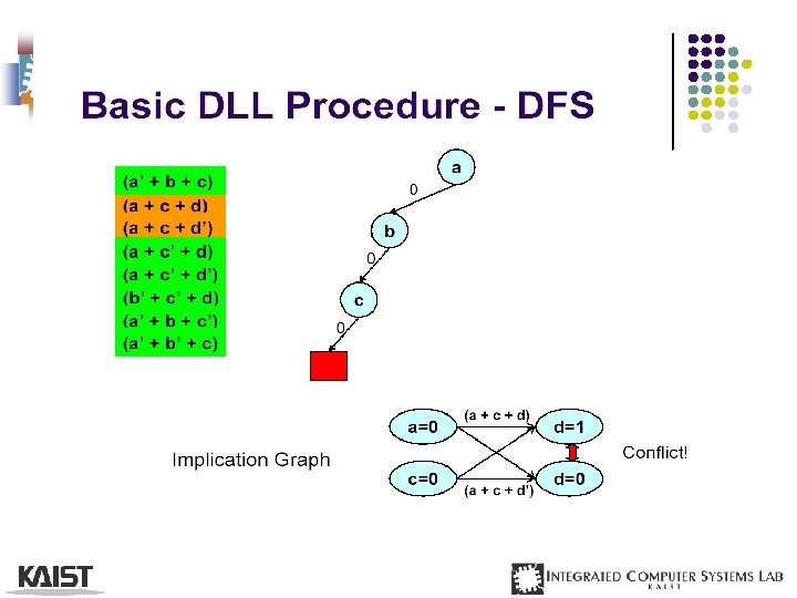 Implications and Boolean Constraint Propagation v Implication n v Unit clause rule (rule for elimination of one literal clauses) n n v An unsatisfied clause is a unit clause if it has exactly one unassigned literal. The unassigned literal is implied because of the unit clause. Boolean Constraint Propagation (BCP) n v A variable is forced to be assigned to be True or False based on previous assignments. Iteratively apply the unit clause rule until there is no unit clause available Workhorse of DLL based algorithms.