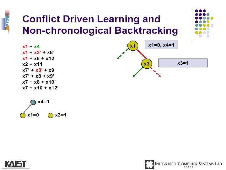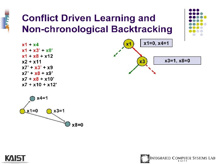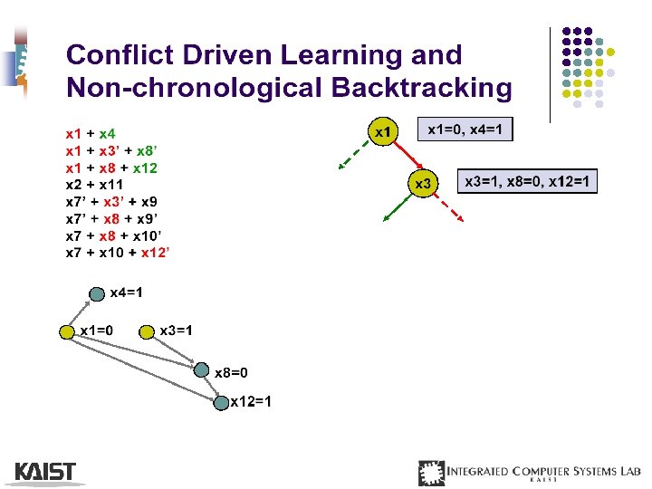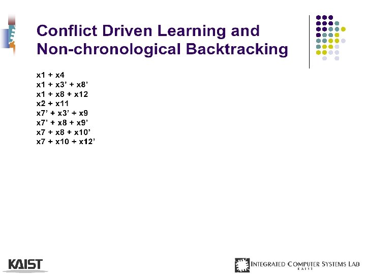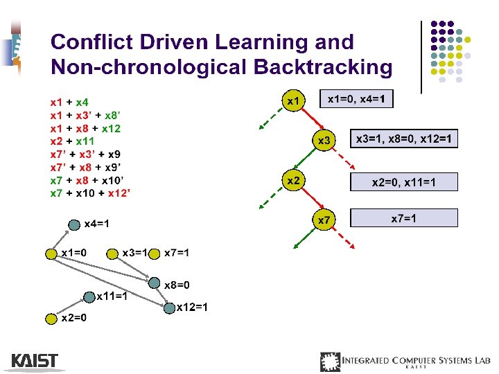 GRASP v Marques-Silva and Sakallah [SS 96, SS 99] n v v v J. P. Marques-Silva and K. A. Sakallah, ”GRASP – A New Search Algorithm for Satisfiability, ” Proc. ICCAD 1996. (49 citations) Incorporates conflict driven learning and non-chronological backtracking Practical SAT instances can be solved in reasonable time Bayardo and Schrag’s Rel. SAT also proposed conflict driven learning [BS 97]