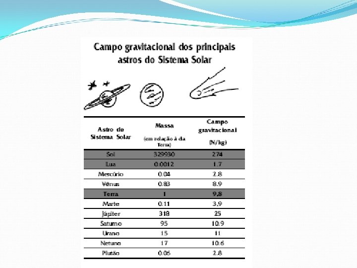 Exemplo 04 Um planeta X tem gravidade g. X, massa MX, e raio RX. Um outro planeta Y tem metade da massa do planeta X, porém o dobro do raio. Qual a relação entre as gravidades g. X e g. Y, dos planetas X e Y, respectivamente?