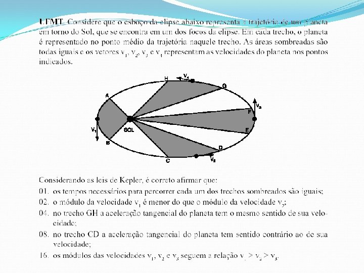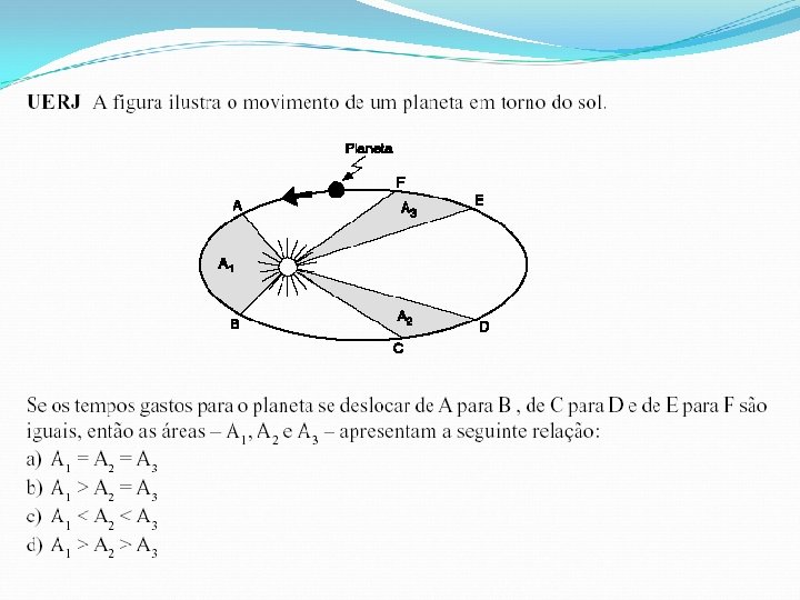 2ª Lei de Kepler – Lei das Áreas A linha imaginária que liga um planeta até o Sol varre áreas iguais em iguais intervalos de tempo.