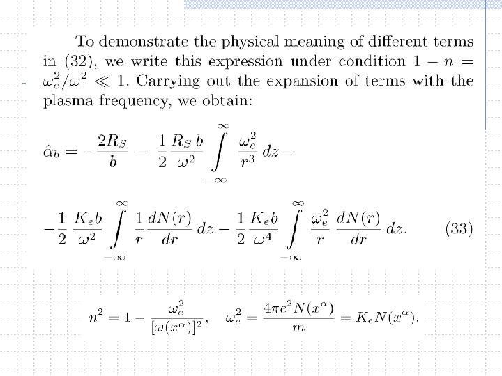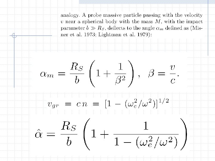 Comparition with other works Kulsrud, Loeb, 1992, Ph. Rv. D. . 45. . 525 K Broderick, Blandford, 2003 Ap&SS. 288. . 161 B Broderick, Blandford, 2003 MNRAS. 342. 1280 B The photon moves in gravitational field and in homogeneous plasma exactly like a massive particle with the following parameters