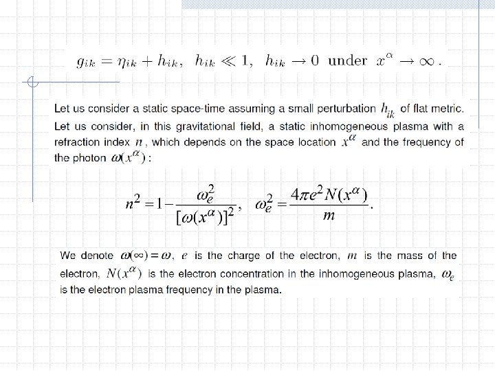 Gravitational lensing in plasma, previous results D. O. Muhleman and I. D. Johnston, 1966; D. O. Muhleman, R. D. Ekers, and E. B. Fomalont, 1970. A. P. Lightman, W. H. Press, R. H. Price, S. A. Teukolsky, Problem Book in Relativity and Gravitation, 1979. P. V. Bliokh and A. A. Minakov, Gravitational Lenses (Naukova Dumka, Kiev, 1989), in Russian. In previous papers of different authors concerning deflection of light by both gravitation and plasma there was separated consideration of two effects: Gravitational deflection of light in vacuum It does not depend on frequency + Deflection of light in non-homogeneous medium It depends on frequency if the medium is (non-relativistic effect) dispersive, but is equal to zero if the medium is homogeneous