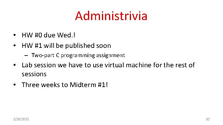 Administrivia • HW #0 due Wed. ! • HW #1 will be published soon – Two-part C programming assignment • Lab session we have to use virtual machine for the rest of sessions • Three weeks to Midterm #1! 2/28/2021 32