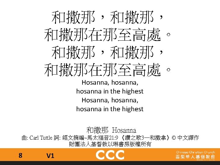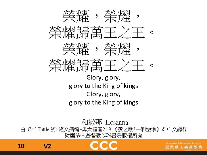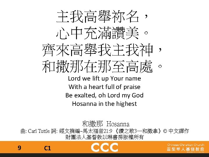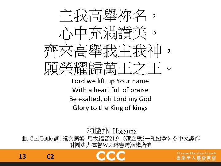 祢為我釘身受死 抹去我的污穢 祢是我神 是我王 我心欣慰 我為祢張開我口 向世界高聲唱 竭力讚揚 願永傳祢大愛 You died for me on the cross, washed away my sins for You are my God, You’re my king I am grateful. I’ll praise Your name with my voice, praising You forever. With every breath, I’ll sing of Your great love. 祢是我神 You are my God 曲﹑詞: 霍志鵬《敬拜者的心》© 香港學園傳道敬拜者使團版權所有 26 C 1