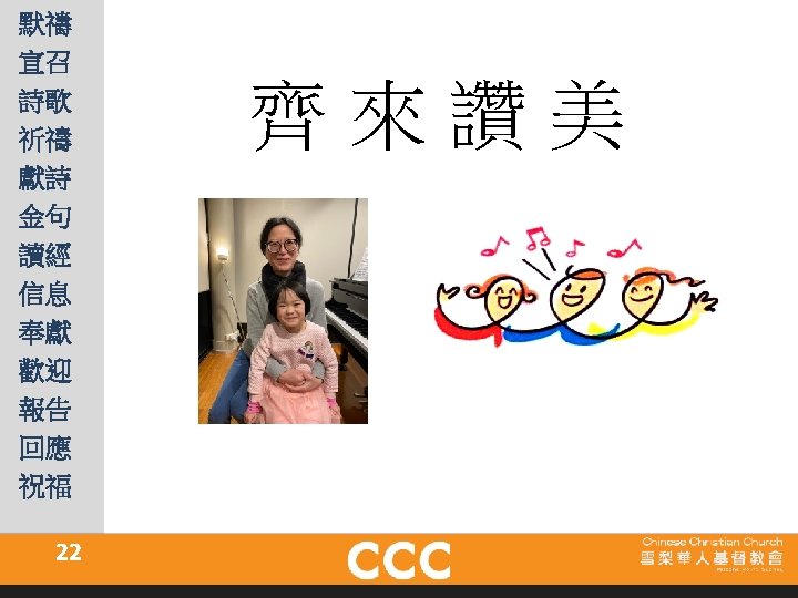 祢的信實廣大, 清晨復清晨,更經歷新恩; 我所需用,祢恩手豐富預備, 祢的信實廣大,顯在我身。 Great is Thy faithfulness! Morning by morning new mercies I see All I have needed Thy hand hath provided Great is Thy faithfulness, Lord, unto me! 祢的信實廣大 G r e a t i s T h y F a i t h f u l n e s s Hymns of Life 生命聖詩 18 首 21 C