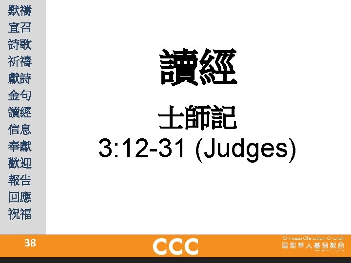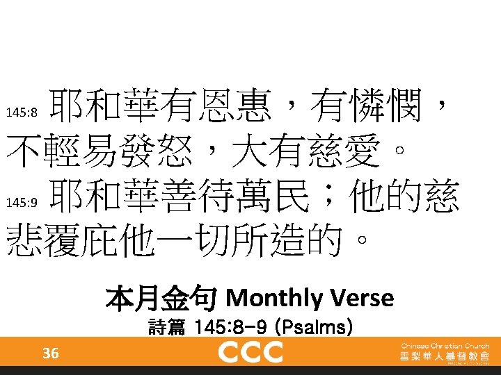The Lord is gracious, kind and tender. He is slow to get angry and full of love. 145: 9 The Lord is good to all. He shows deep concern for everything he has made. 145: 8 本月金句 Monthly Verse 詩篇 145: 8 -9 (Psalms) 37