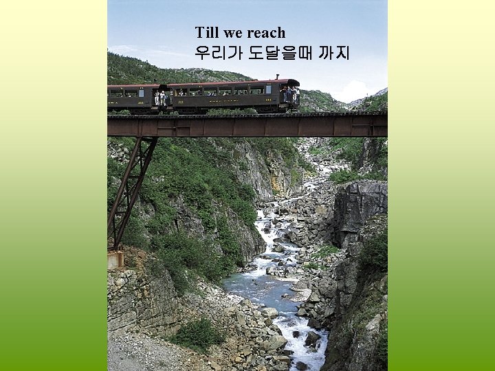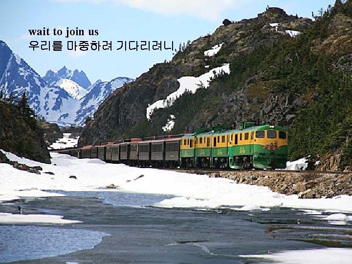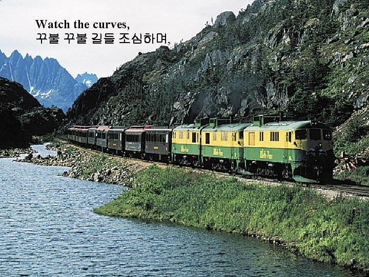 If you have never seen this railway before, it runs from Whitehorse, Yukon to Skagway, Alaska. 혹시 이 철도를 이전에 본적이 없을 경우, 이 철도는 알라스카의 유콘지방 의 화잍호스에서 스카그웨이 까지 달린다. It is a fantastic sight in real life. 그것은 실제로 기상천외의 광경이다. For those of you who have been there you will know what I am talking about. 그곳에 가보셨다면 제가 무슨 말을 하고 있는 지 잘 아실 것이다.