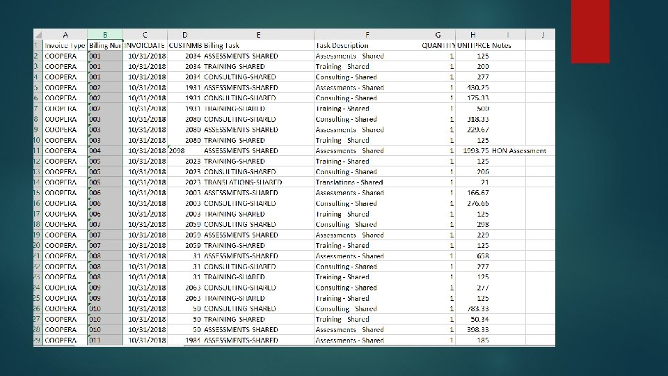 Spreadsheet Breakdown H: Billing Task – Will show on your Invoice, this is your revenue GL Account I: Task Description – On Invoice, should match what you have in GP for Billing Task. J: Quantity K: Unit Price L: Billing Notes –will show on the invoice under task description Invoice Sample