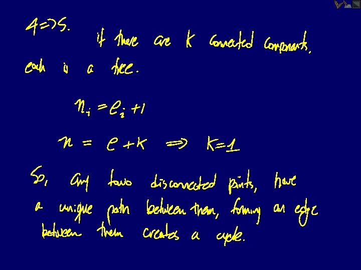 Theorem: Let G be a graph with n nodes and e edges. The following are equivalent: 1. G is a tree (connected, acyclic) 2. Every two nodes of G are joined by a unique path 3. G is connected and n = e + 1 4. G is acyclic and n = e + 1 5. G is acyclic and if any two nonadjacent points are joined by a line, the resulting graph has exactly one cycle.