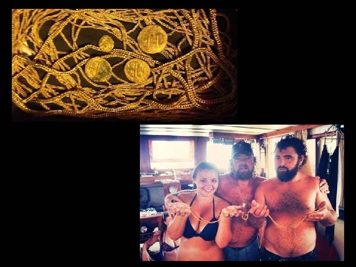 Treasure Hunting Today • A Florida treasure-hunting family found an estimated $300, 000 worth of gold coins and chains off the coast of Florida over Labor Day weekend in 2013. • Rick Schmitt and his family uncovered the treasure 150 yards offshore. • The treasure comes from the wreckage of a convoy of 11 ships that were destroyed in a hurricane off the coast of Florida in 1715 while en route from Havana to Spain. • According to the ships' manifests, $400 million worth of treasure was on board and so far only $175 million has been found.