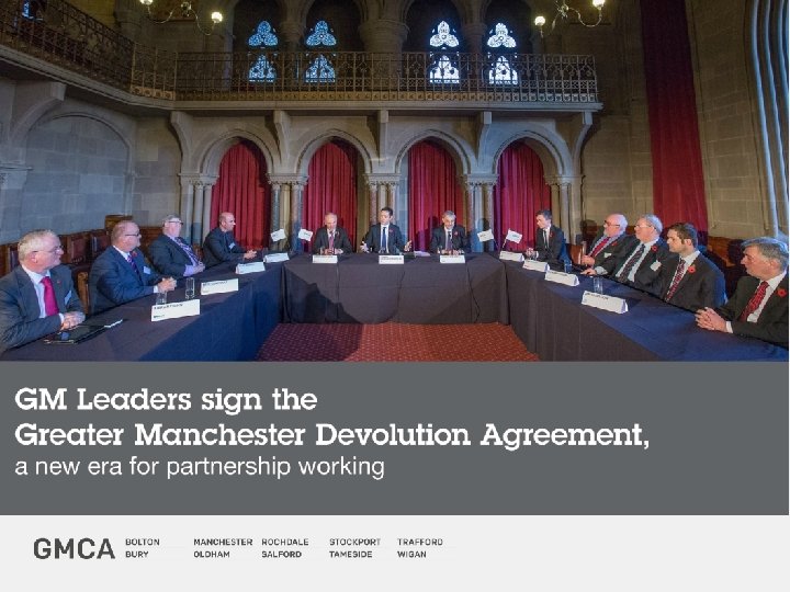 Devolution- GM Agreement • Signed November 2014 by council Leaders and government with further devolution announced as part of the budget in July 2015. • Agreed new powers and responsibilities around transport, planning and housing, skills and business support and transport. • In exchange GM will have an elected mayor from 2017 who will oversee the work of the GMCA alongside council leaders • GMCA has appointed an interim mayor, Tony Lloyd, who will chair the GMCA until then.