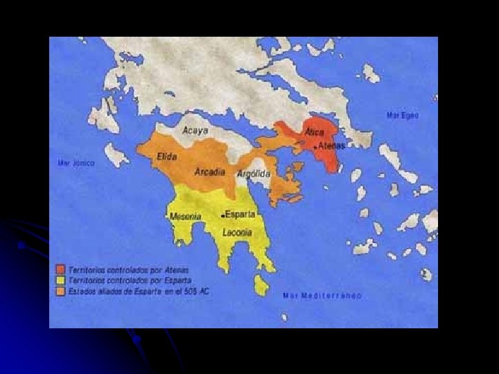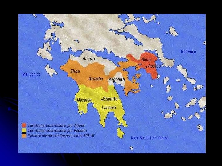 l En esta ciudad, los únicos ciudadanos con derecho eran los dorios conquistadores, que tomaron el nombre de espartanos. l Exentos de las tareas agrícolas se dedicaban al gobierno, a la caza y al entrenamiento militar y deportivo. l El comercio quedaba a cargo de los periecos, hombres libres pero sin poder político.