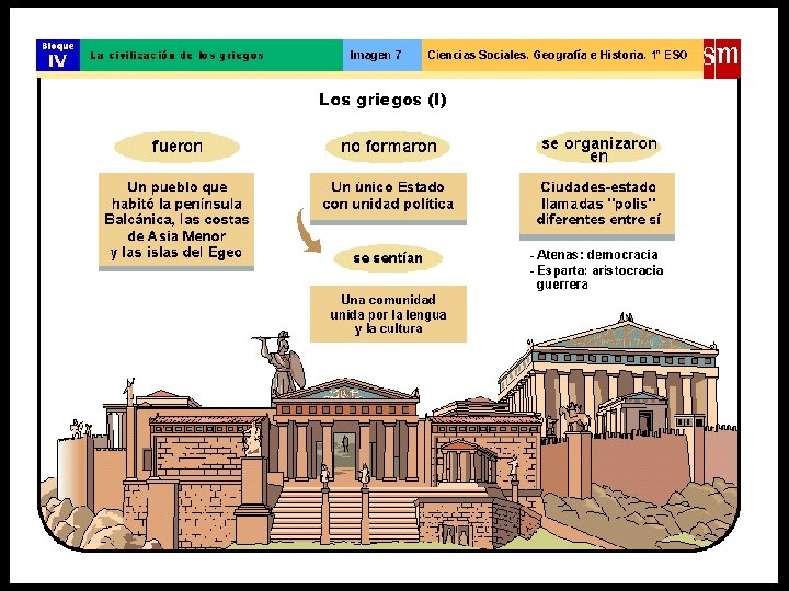 l Los griegos no formaron un estado común, vivían en polis (ciudades independientes), aunque todos formaban parte de la Hélade, una cultura común que compartía la lengua, la religión y las formas de vida y pensamiento.