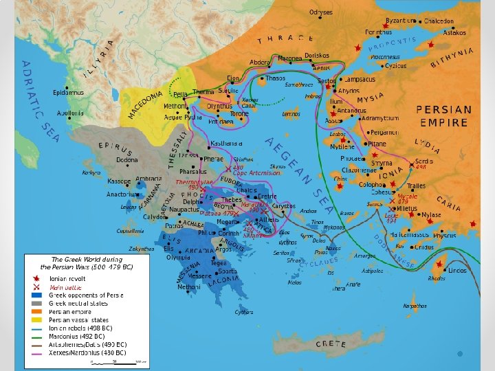 Persian Wars • Ionian Revolt o Greeks in western Persia revolted against the Persians o Took the Persians 5 years to stop the rebellion • 490 BCE o Darius sends troops to Eretria and Athens (both helped in the Ionian Revolt) o Eretria falls; survivors sent into exile in Iran o Athens: hoplites defeat Persians at the Battle of Marathon • 480 BCE o o Xerxes sends forces and takes over portions of southern Greece Hellenic League (Sparta and allies) 300 Spartans die at Thermopylae Persians sack Athens, then navy is destroyed at Salamis • Defeat of Persia leads to the creation of the Delian League o Alliance of city-states under the leadership of Athens o Athens eventually takes advantage of the League and becomes imperial power