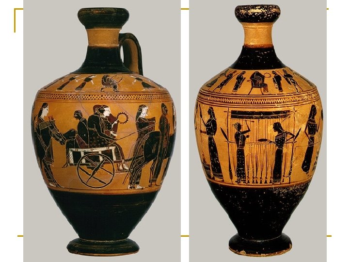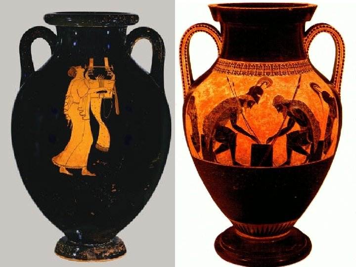 Black–Figure Technique Scene from a black-figure amphora from Athens, 6 th century BC, now in the Louvre, Paris n Black-figure is called that because the people (the figures) are black, and the background is a reddish brown. q q Black-figure technique was likely developed around 700 B. C. in Corinth. As the name implies, figures appeared, after the firing of the pot, as black silhouettes against the background of the light red or yellowish clay of the pot. Within the black figures, incised lines revealed the red clay beneath, allowing the artist to trace the inner details of the figure. Actually black figure is done all with one type of clay. The clay found near Athens has a lot of iron in it, so it looks black when it is wet. But if you fire it in an kiln where there is plenty of air getting in, the clay rusts, and turns red. This is because the iron mixes with the oxygen in the air. If you fire it in an kiln with no air getting in, the iron can't mix with oxygen, and the pot stays black. So you can have either red or black pots.