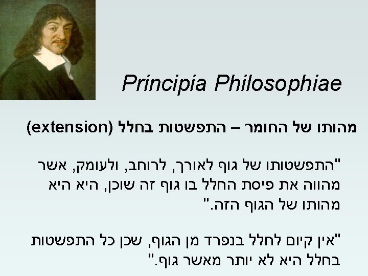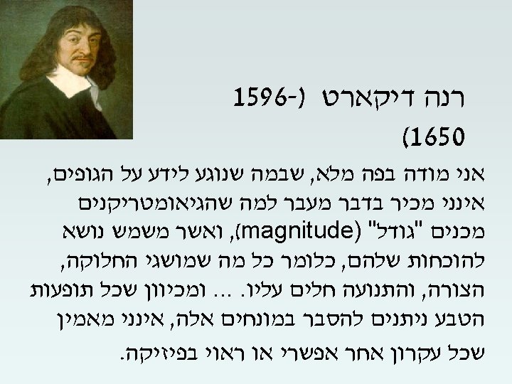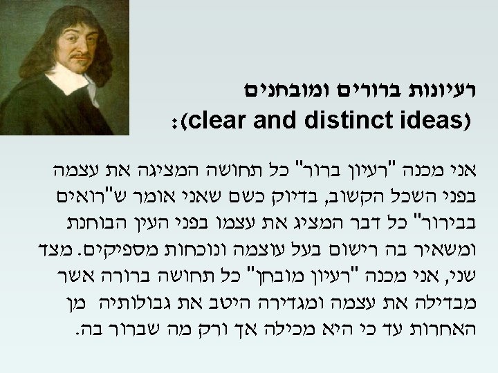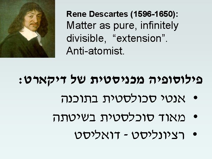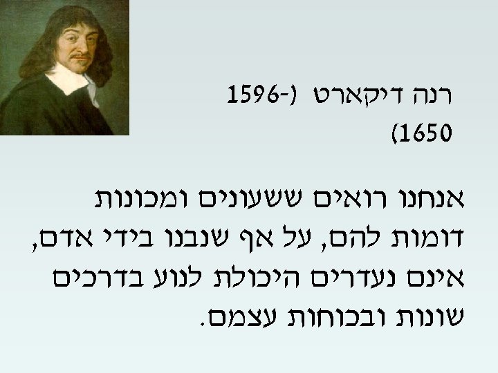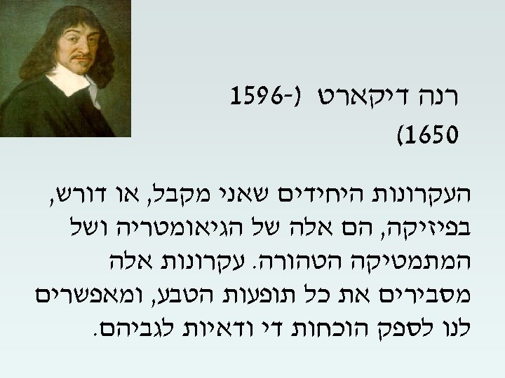 דיקארט רנה (1596 -1650) 1606 Jesuit Collège Royal Henry-Le-Grand (La Flèche) 1616: Law at University of Poitiers 1626– 1628: Rules for the Direction of the Mind). 1630: Le Monde (not published – heard about Galileo) 1637: Discours de la méthode (Discourse on the Method). 1641: Méditations Metaphysiques 1644: Principia philosophiae.