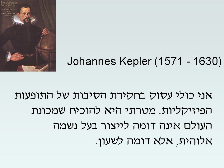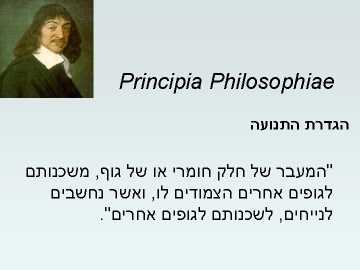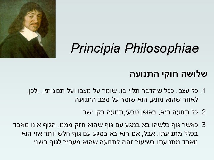 Principia Philosophiae "שימור אנרגיה" כעקרון מרכזי לבריאת היקום It is obvious that when God first created the world, He not only moved its parts in various ways, but also simultaneously caused some of the parts to push others and to transfer their motion to these others. So in now maintaining the world by the same action and with the same laws with which He created it, He conserves motion; not always contained in the same parts of matter, but transferred from some parts to others depending on the ways in which they come in contact.