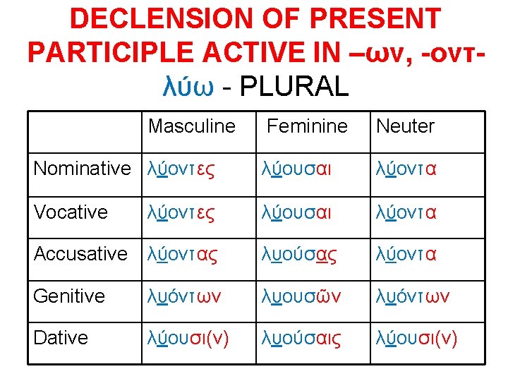 DECLENSION OF PRESENT PARTICIPLE ACTIVE IN –ων, -οντλύω - PLURAL Masculine Feminine Neuter Nominative λύοντες λύουσαι λύοντα Vocative λύουσαι λύοντα Accusative Genitive Dative λύοντες