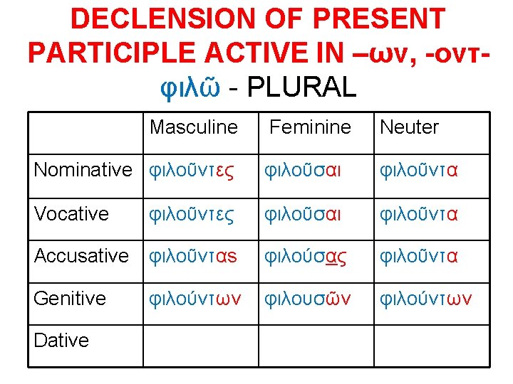 DECLENSION OF PRESENT PARTICIPLE ACTIVE IN –ων, -οντφιλῶ - PLURAL Masculine Feminine Neuter Nominative φιλοῦντες φιλοῦσαι φιλοῦντα Vocative φιλοῦντες φιλοῦσαι φιλοῦντα Accusative φιλοῦνταs φιλούσας φιλοῦντα Genitive Dative