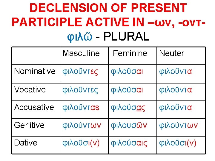 DECLENSION OF PRESENT PARTICIPLE ACTIVE IN –ων, -οντφιλῶ - PLURAL Masculine Feminine Neuter Nominative φιλοῦντες φιλοῦσαι φιλοῦντα Vocative φιλοῦσαι φιλοῦντα Accusative Genitive Dative φιλοῦντες