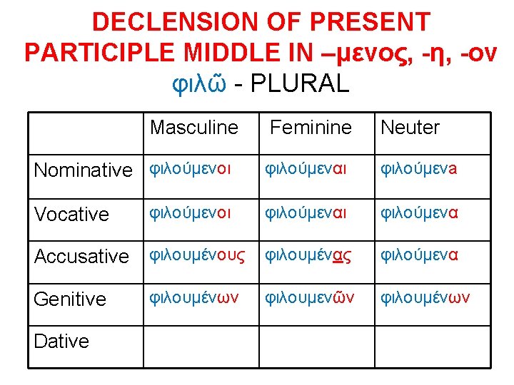 DECLENSION OF PRESENT PARTICIPLE MIDDLE IN –μενος, -η, -ον φιλῶ - PLURAL Masculine Feminine Neuter Nominative φιλούμενοι φιλούμεναι φιλούμενa φιλούμενoι φιλούμενα Vocative Accusative Genitive Dative