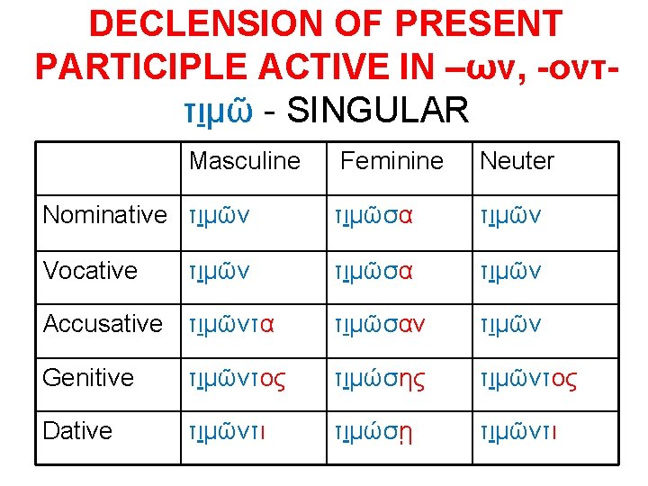 DECLENSION OF PRESENT PARTICIPLE ACTIVE IN –ων, -ονττιμῶ - SINGULAR Masculine Feminine Neuter Nominative τιμῶν τιμῶσα τιμῶν Vocative τιμῶσα τιμῶν Accusative τιμῶντα τιμῶσαν τιμῶν Genitive τιμώσης τιμῶντος Dative τιμῶντος