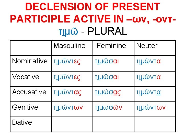 DECLENSION OF PRESENT PARTICIPLE ACTIVE IN –ων, -ονττιμῶ - PLURAL Masculine Feminine Neuter Nominative τιμῶντες τιμῶσαι τιμῶντα Vocative τιμῶσαι τιμῶντα Accusative Genitive Dative τιμῶντες