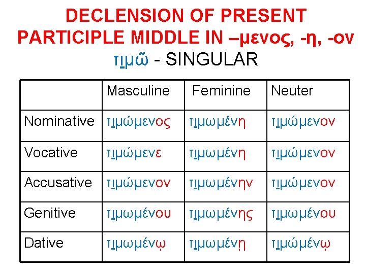 DECLENSION OF PRESENT PARTICIPLE ACTIVE IN –ων, -ονττιμῶ - SINGULAR Masculine Feminine Neuter Nominative τιμῶν τιμῶσα τιμῶν Vocative τιμῶσα τιμῶν Accusative Genitive Dative τιμῶν