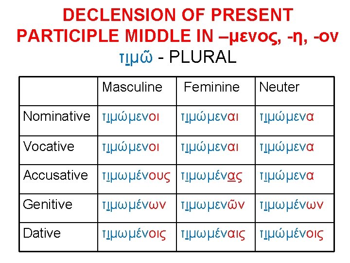 DECLENSION OF PRESENT PARTICIPLE MIDDLE IN –μενος, -η, -ον τιμῶ - PLURAL Masculine Feminine Neuter Nominative τιμώμενοι τιμώμενα Vocative τιμώμεναι τιμώμενα Accusative Genitive Dative τιμώμενοι