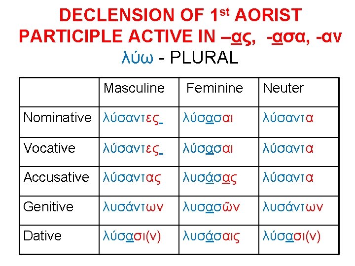 DECLENSION OF 1 st AORIST PARTICIPLE ACTIVE IN –ας, -ασα, -αν λύω - PLURAL Masculine Nominative λύσαντες Vocative Accusative Genitive Dative Feminine Neuter λύσασαι λύσαντα