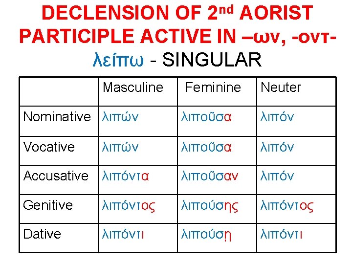 DECLENSION OF 2 nd AORIST PARTICIPLE ACTIVE IN –ων, -οντλείπω - SINGULAR Masculine Feminine Neuter Nominative λιπών λιποῦσα λιπόν Vocative λιποῦσα λιπόν Accusative Genitive Dative λιπών