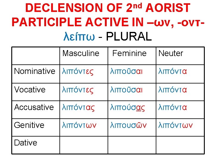 DECLENSION OF 2 nd AORIST PARTICIPLE ACTIVE IN –ων, -οντλείπω - PLURAL Masculine Feminine Neuter Nominative λιπόντες λιποῦσαι λιπόντα Vocative λιποῦσαι λιπόντα Accusative Genitive Dative λιπόντες