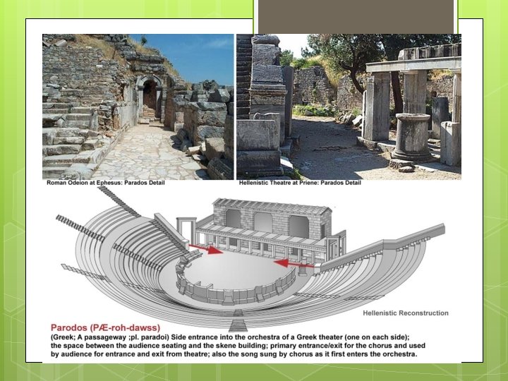 The Structure of Greek Tragedy Greek plays begin in medias res, in the middle of things, and build toward a climactic ending with alternating episodes and Episodes carry the plot forward. The action of the play occurs here. Odes feature the chorus explaining or reflecting on the action of the play. Prologos (1 st episode) Ode (strophe and 2 nd Episode 3 rd Episode antistrophe) Ode (strophe and 4 th Episode antistrophe) Ode (strophe and Exodos (5 th episode) odes. antistrophe)